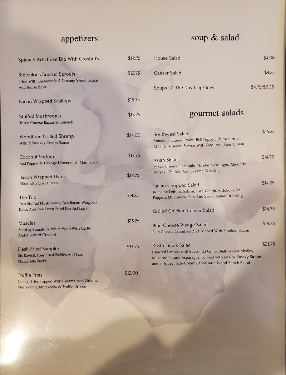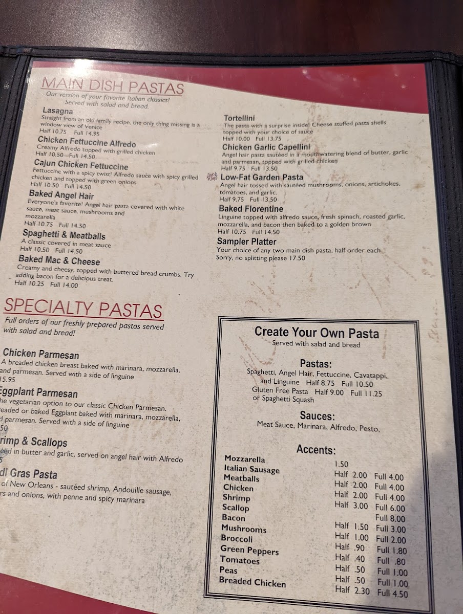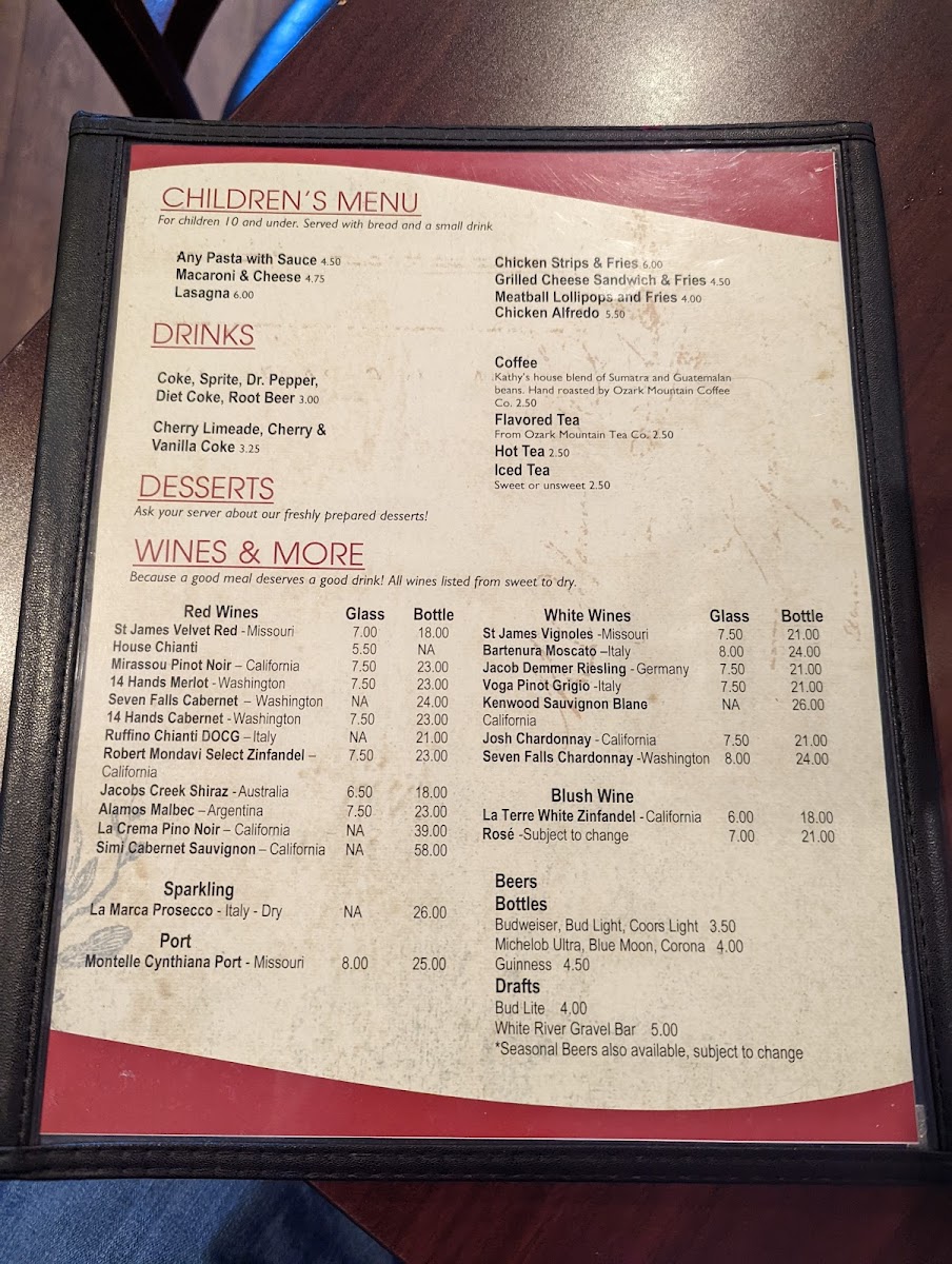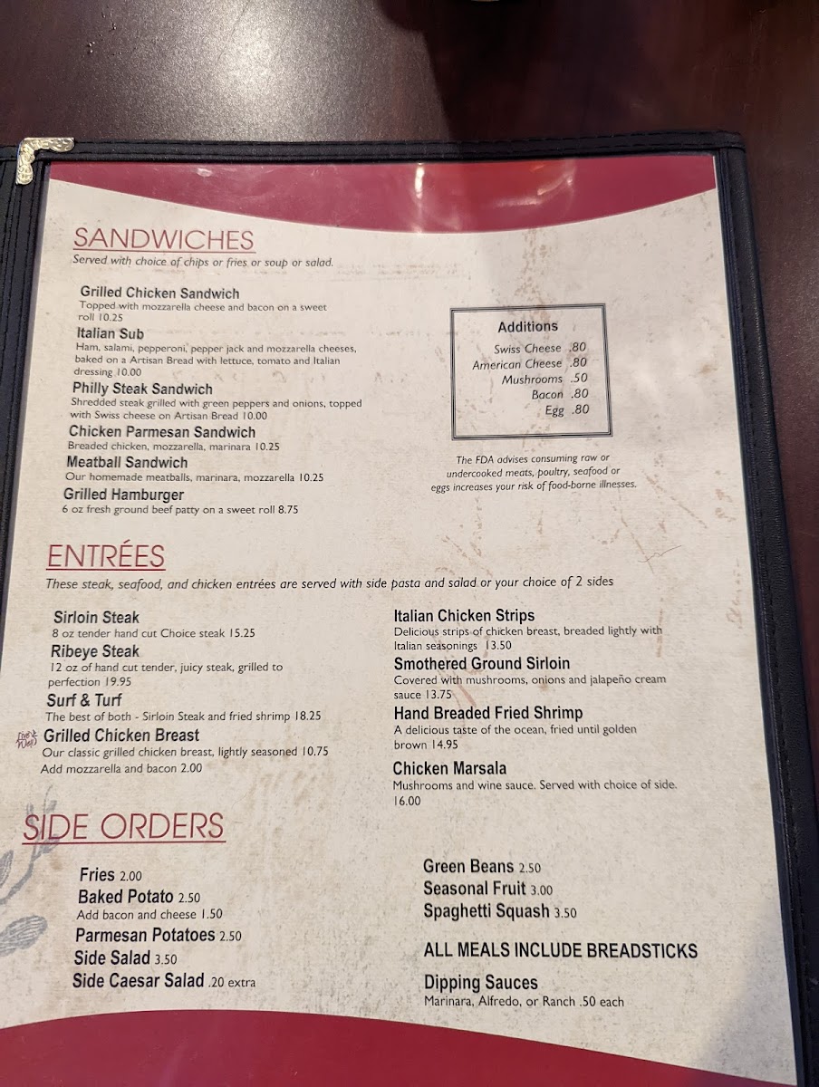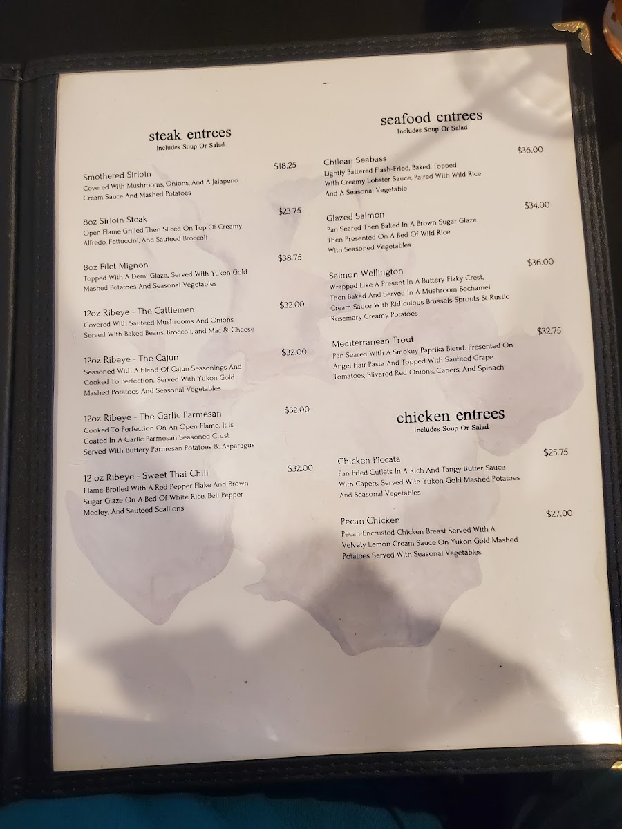 Guests can expect a variety of satisfying options that pair well with the warm, inviting atmosphere—whether it’s a tender cut of steak, fresh seafood, or handcrafted pasta like the baked angel hair. Light soups and simple salads complement the main dishes, creating a balanced and familiar dining experience.
